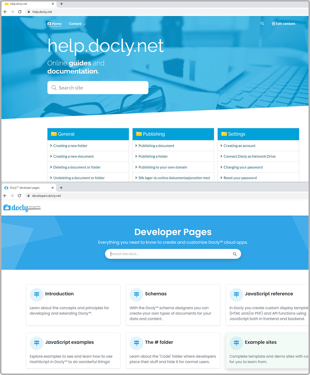 JavaScript-backendin käyttö tarkoittaa – jos sinulla on kokemusta JS:stä, voit aloittaa heti. Käytä linkkejä DOCLY OHJESIVUT ja KEHITTÄJÄSIVUT alla. Sisäänrakennetut toiminnot tekevät konfiguroinnista, mukauttamisesta ja ohjelmoinnista helppoa. Löydät valmiita moduuleja ja malleja, joita voit mukauttaa ja rakentaa omia ratkaisujasi. Tee kaikki itse – tai ota yhteyttä saadaksesi tarvitsemaasi apua.